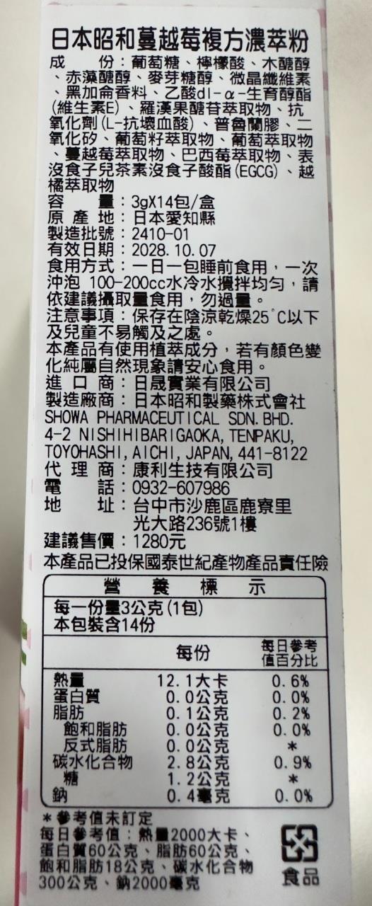 製 造 廠:日本昭和製藥株式會社 SHOWA PHARMACEUTICAL SDN.BHD.