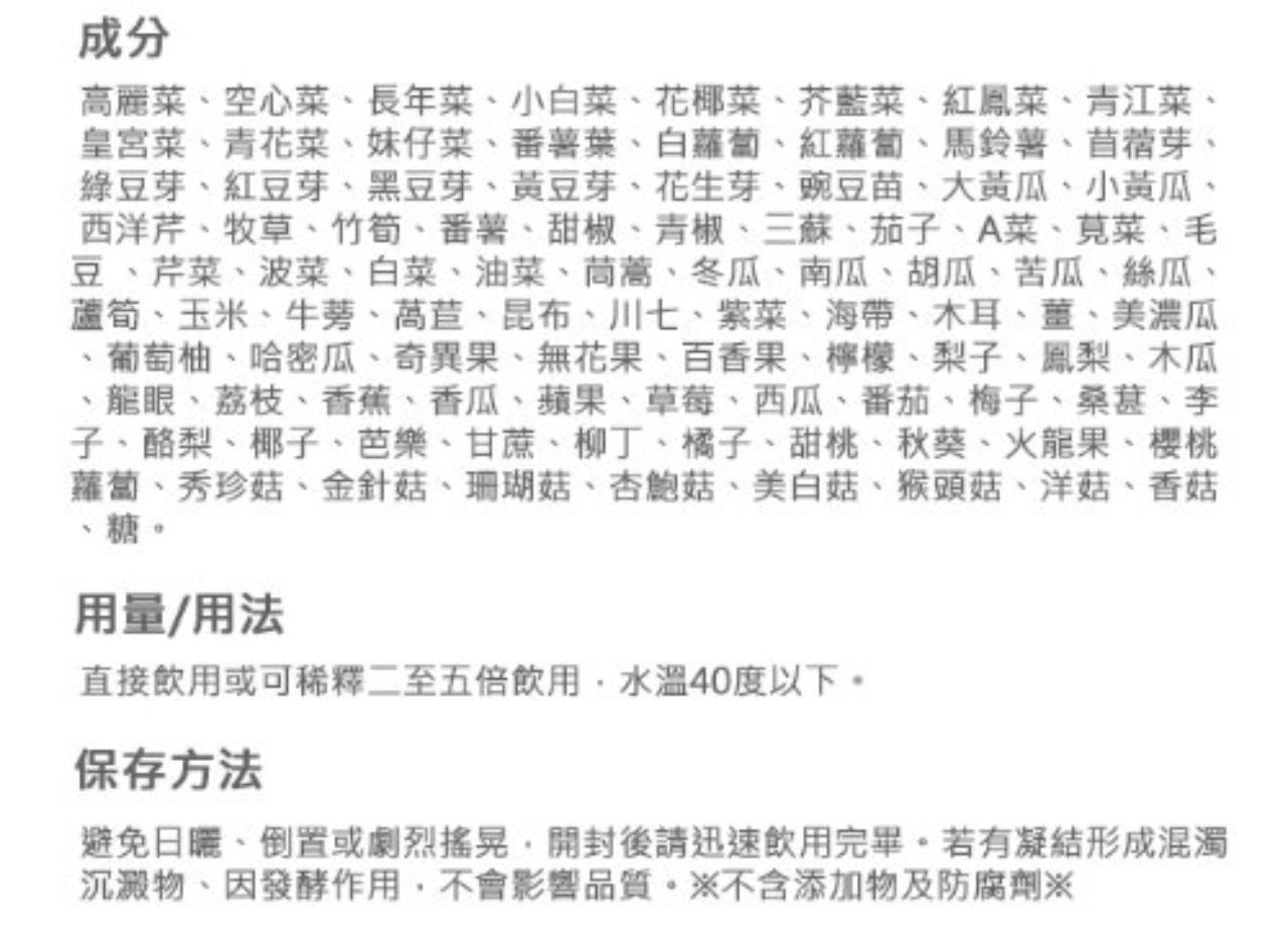 成分:高麗菜、空心菜、長年菜、小白菜、花椰菜、芥藍菜、紅鳳菜、青江菜、皇宮菜、青花菜、妹仔菜、蕃薯葉、白蘿蔔、紅蘿蔔、馬鈴薯、苜蓿芽、綠豆芽、紅豆芽、黑豆芽、黃豆芽、花生芽、豌豆苗、大黃瓜、小黃瓜、西洋芹、竹筍、蕃薯、甜椒、青椒、山蘇、茄子、A菜、莧菜、毛豆、芹菜、菠菜、白菜、油菜、茼蒿、冬瓜、南瓜、胡瓜、苦瓜、絲瓜、蘆筍、玉米、萵苣、昆布、紫菜、海帶、木耳、薑、秋葵、美濃瓜、葡萄柚、哈密瓜、奇異果、火龍果、百香果、鳳梨、檸檬、梨子、木瓜、龍眼、荔枝、香蕉、洋香瓜、蘋果、草莓、西瓜、蕃茄、梅子、桑葚、李子、酪梨、椰子、芭樂、甘蔗、柳丁、橘子、甜桃、葡萄、密世界、香吉士、蓮霧、櫻桃蘿蔔、秀珍菇、金針菇、珊瑚菇、杏鮑菇、美白菇、猴頭菇、洋菇、香菇、糖