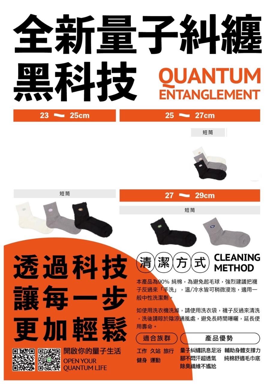 透過量子糾纏黑科技,提升財富能量福氣值,並感受量子糾纏的作用與能量,開啟大家的量子生活!! 品名:QLAB量子不倒襪(短筒黑-中 25~27cm) 材質: 90%棉 2%聚醯胺纖維 8%聚氨酯纖維 洗滌方式: 適合洗衣機、手洗、低溫烘乾 每雙售價:980元 購買1雙,售價980元,含稅含運,限店到店。 加入金檜傳說購物平台會員另有優惠喔!