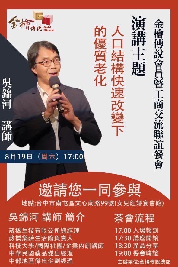 以天然健康、無毒養生樂活、愛環保愛地球為訴求的金檜傳說總部,8月19日在女兒館舉辦「金檜傳說會員暨跨業工商交流聯誼餐會」第5場講座,邀請葳橋生技有限公司總經理也是葳橋樂齡生活館負責人的吳錦河演講,以『人口結構快速改變下的優質老化』為題,說明人口結構變動趨勢、台灣失智人口分析及長照2.0如何申請與高齡服務產業的需求等點出銀髮相關產業發展,提供給會員們對長照2.0有更深的認識,參加的人踴躍聽講獲益良多。