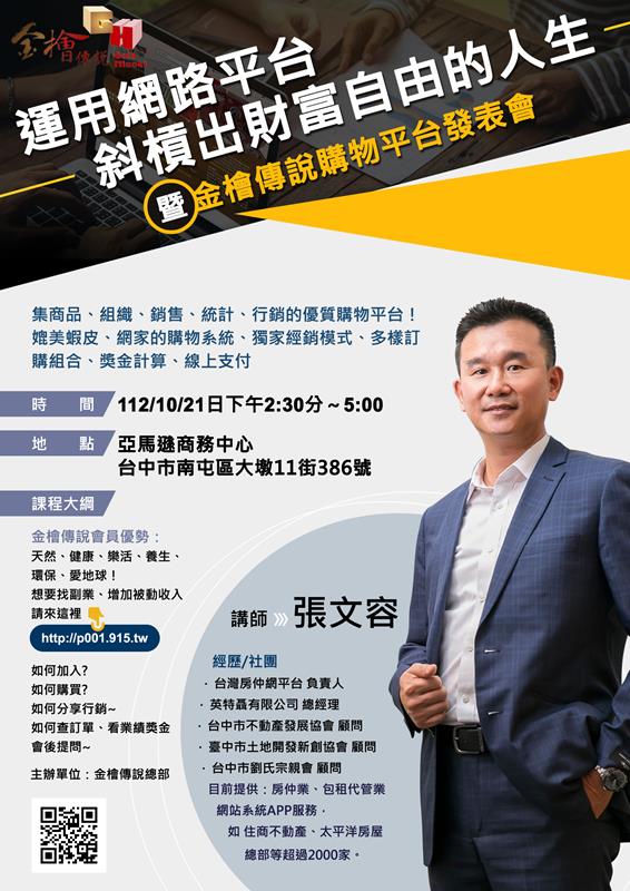 :運用網路平台斜槓出財富自由的人生暨金檜傳說購物平台發表會【講座】