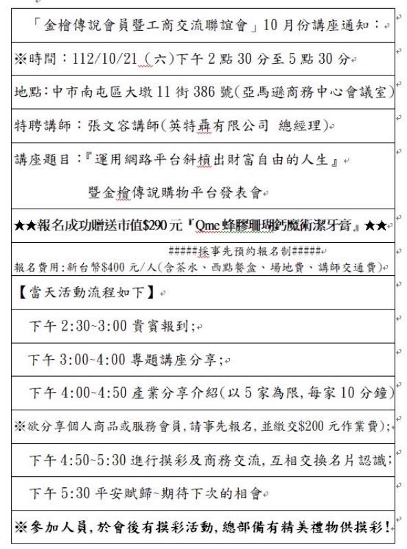 【講座】金檜傳說會員暨工商交流聯誼茶會公告112/10/21